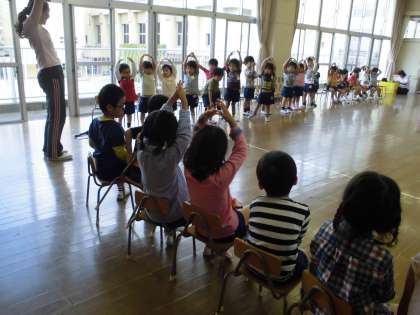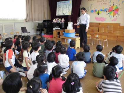 お誕生日を迎えた7人のお友達を囲んで、みんなでお祝いしました。歌のプレゼントは、「ハッピーフレンズ」「どんぐりころころ」「大きなくりの木の下で」でした。振り付きで歌いました。園長先生の実験は、噴水でした。