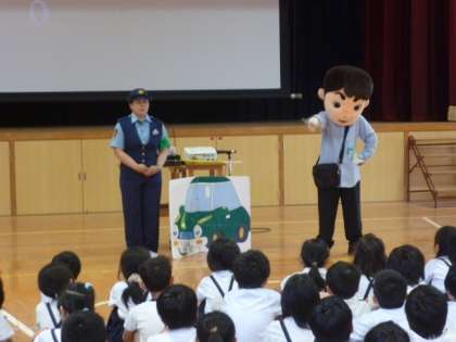 7日(金)大阪府警よりおまわりさんに来ていただいて、生活安全教室が行われました。毎年、この時期に実施しています。いつもの「ゆうかい するぞう」君が登場しました。(今年は高学年では「わるいこと したろう」君と呼んでいました。)びっくり作戦やおいでおいで作戦でたくみに子どもたちを車につれこもうとする事例を紹介し、身を守るための手段を学びました。特に、大きな声を出すことの大切さを学びました。