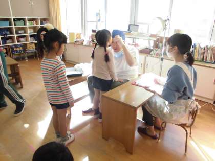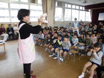 保育室での歯科検診の後、ホールで虫歯予防指導をしていただきました。