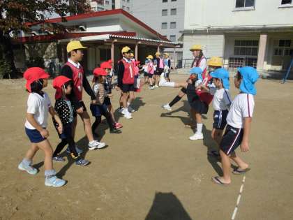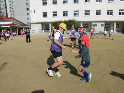 11月11日 ばら組さんが滝川小学校の5年生と一緒に運動をしました。同心保育園の園児も一緒に運動しました。