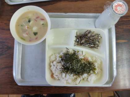 給食は、季節ごと、大きな行事ごとに特別な献立が登場します。9日(木)は、正月の行事献立で、ちらしずし、雑煮、ごまめです。とてもおいしくいただきました。