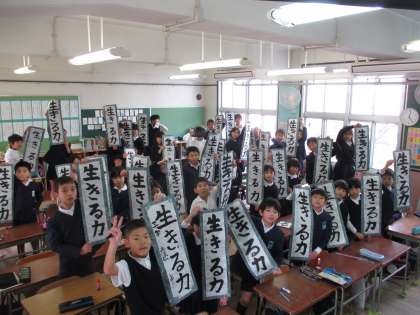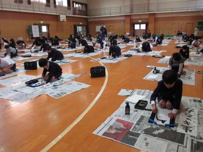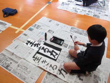 3・4年生は、本日書き初めを講堂で行いました。講堂の床一面に新聞を敷いて、お手本を置き、縦長の半紙と向き合って、心を込めて書きました。これは、3年生の完成作品です。