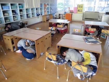 まず、地震が起きたとの想定で、机の下に体を隠しました。