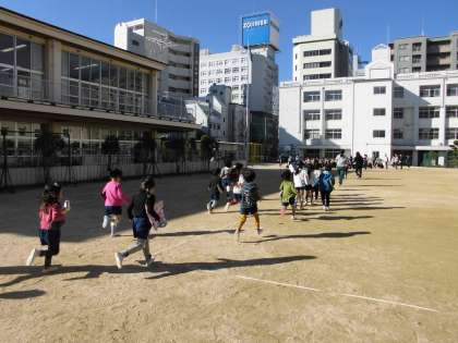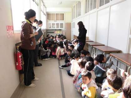次に、津波警報発令を想定して、小学校の4階まで逃げました。