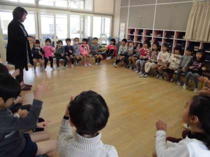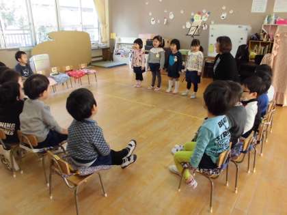 たんぽぽ組は「むっくりくまさん」、さくら組は「ゆきのペンキやさん」、ばら組は「いつまでもともだち」「さんぽ」を習いました。