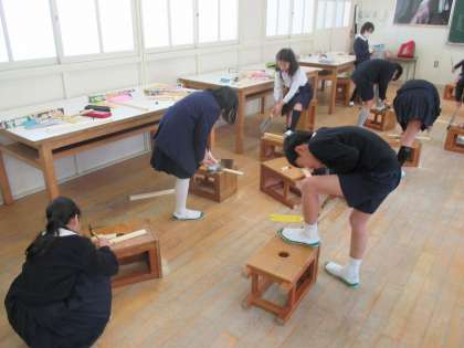 図画工作で、木材を切ってつなぎ合わせて、「自分だけの木」をつくっています。切ったりつないだりするのに、のこぎりや金づちを使います。安全に気を付けて上手に扱えるように、友達と協力しながら取り組んでいます。完成が楽しみです。