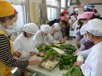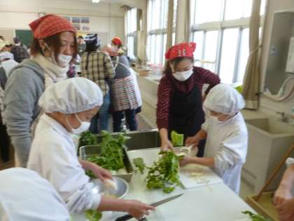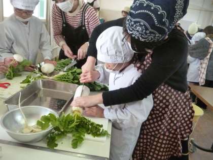 3年生は、昨日収穫した田辺大根や天王寺蕪を使って漬け物づくりに挑戦しました。漬け物を作るのも初めてなら、包丁を持つのも初めての子どもたち。不安いっぱいですが、おうちの方が後ろから、包丁を握って手伝ってくれました。親子でつくる漬け物は、きっと優しい味がしたでしょうね。