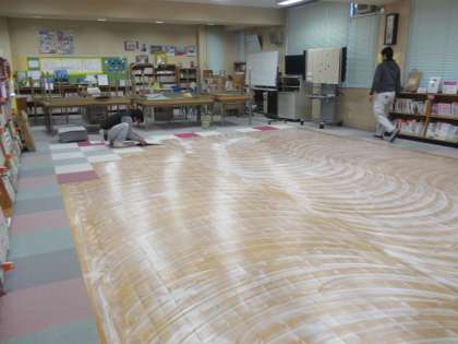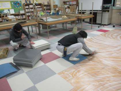 図書室でカーペットを張り替え中!業者の方が1枚1枚丁寧にカーペットをならべています。いったい、どんなフロアになったのでしょうか。新しくなった図書室へ、ぜひ足をお運びください!