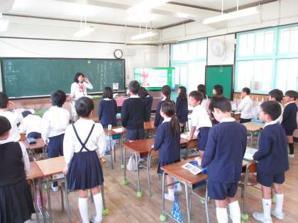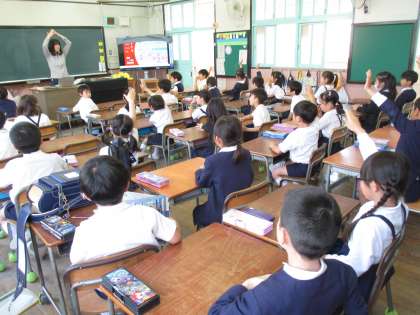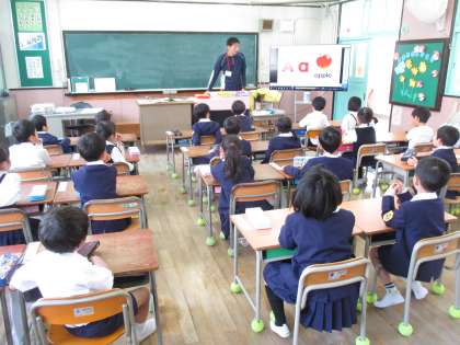 今年から毎週木曜日の朝の時間の取り組みとして「英語タイム」がスタートしました。今日は大型ディスプレイを見たり、先生と一緒に動いたりして学習しました。1年生も楽しく学ぶことができましたよ。