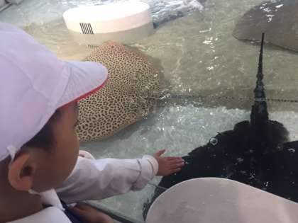 海遊館の最後にえいやサメにタッチする場所があります。みんなこわごわさわっています。