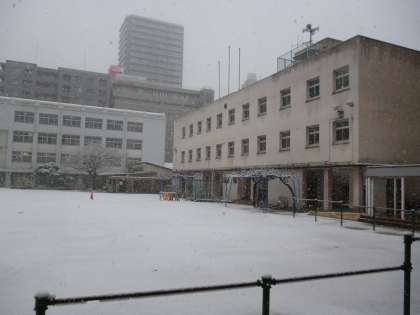雪が降り続いています。雪国の学校のようです。チューリップも寒そうです。