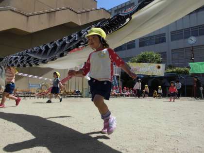 たんぽぽ組さんは、ゴールのこいのぼりまで、まっすぐ走りました。さくら組さんはコーンをぐるっと回って走りました。ばら組さんは途中でフープを2回くぐりました。