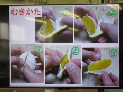 1年生の教室では、子どもたちが大型テレビに映った河内ばんかんのむきかたを見て、先月のあまなつのむきかたを思い出していました。