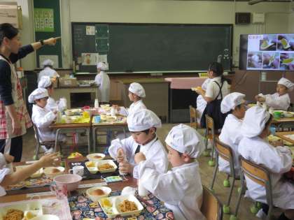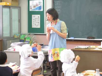 栄養教諭の旭先生が、今日の献立のパンについてお話をしてくれました。みんなとても静かに聞いていました。