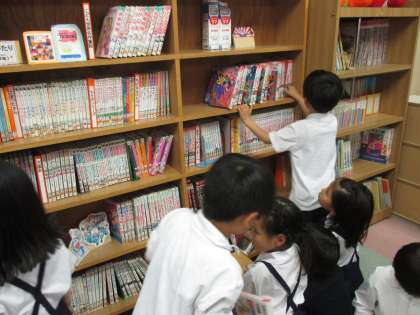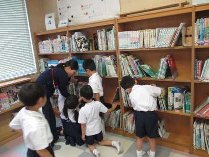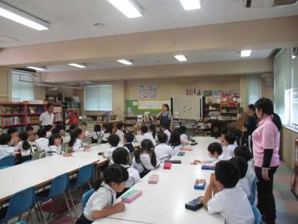 1年生全員で、学校図書館支援員の津村さんから学校図書館の