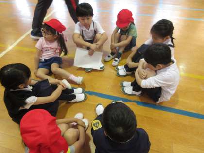 ばら組さんを迎えて少しはじめは緊張していた様子でしたが、「こっちにきてね。」「すわってね。」「いいよ。」とやさしく声をかけていました。よくがんばりました。
