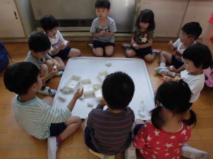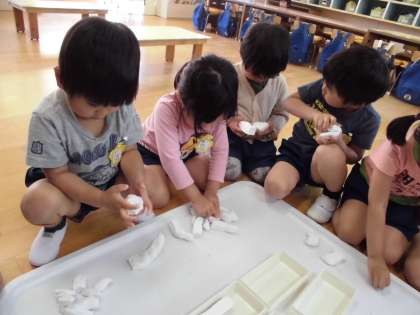 5月11日(木) たんぽぽ組さんが、紙粘土で遊びました。こねこねこね・・・何ができるかな?