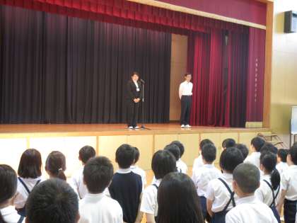 今日の児童朝会で、校長先生が教育実習生を紹介されました。多くのことを学ぶ実習期間になってほしいと思います。