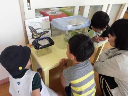 幼稚園のミカンの木に、ナミアゲハの幼虫がいました。飼育ケースの中に入れて、観察しています。大きくなるにつれて、色が白黒から緑色に変ったり、さなぎになったり・・・早く蝶にならないかなあ。