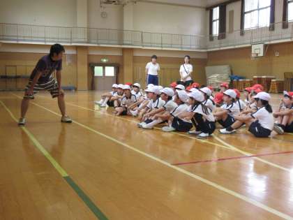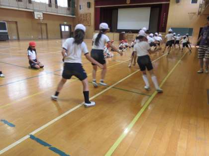 今日は講堂で体育をしました。反復横とびできるかな。中央ラインから両側100cmの2本のラインをサイドステップします。川村先生のお話をしっかり聞いていますね。いざチャレンジ!
