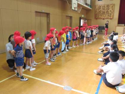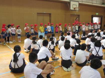今日の児童集会では、滝川ふれあいカーニバルのお店紹介がありました。幼稚園のばら組さんも紹介しましたよ。