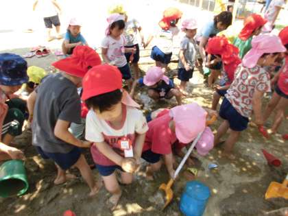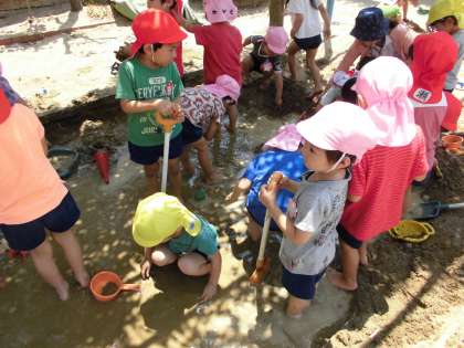 5月30日 園庭の砂場に水を入れて、泥遊びをしました。