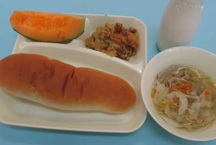 今日の給食は「レーズンパン、牛乳、カレードリア、キャベツのスープ、クインシーメロン」です。