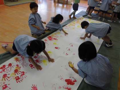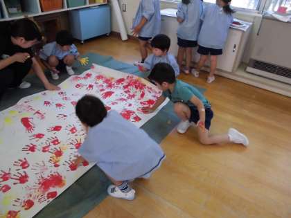 たんぽぽ組は、絵の具を手に付けて、ペタペタと手形をつけました。