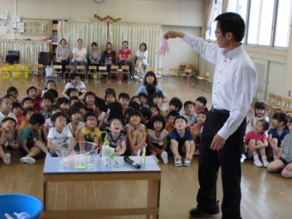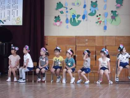 6月21日(水) お誕生会をしました。園長先生の科学教室は、ふくらむ手袋でした。