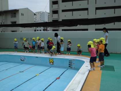 きれいになったプールを、たんぽぽ組さんが見に来ました。