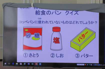 各教室の大型ディスプレイで給食時間に表示します。初日はパンについてのクイズでした。