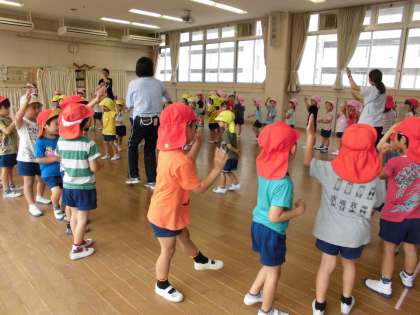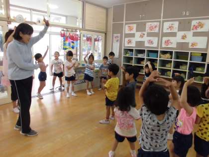 6月28日(水) ばらぐみがたんぽぽぐみに「もったいないばあさん音頭」を教えてくれました。その後全員でホールで練習しました。8月のすっきゃねん滝川で踊ります。
