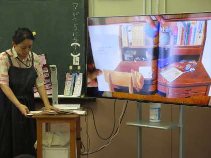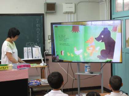 今日はぶっくさんの読み聞かせがありました。書画カメラを使うと小さな絵本も教室で座ったまま聞くことができます。細かい絵もよくみて楽しんでいるこどもたち。静かに聞くことができました。読んでもらったあとは、お礼の言葉がいえました。