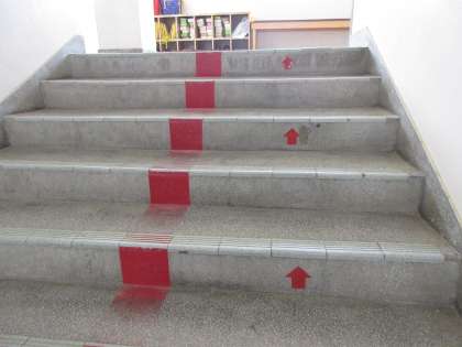 本校の運営に関する計画では、廊下階段の正しい歩行をの仕方を守れるようにする取り組みを行い全教職員で指導しております。階段に赤い矢印をはり自主的に行動できるようにしています。