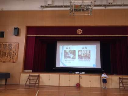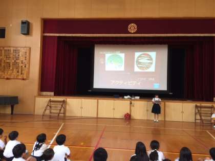 4年生の先生に「もう一度見たいプレゼン発表」を選んでいただきました。選ばれた児童は、講堂の大スクリーンにスライドを写し、みんなの前で発表しました。