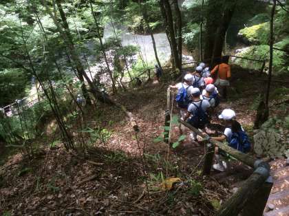 下を流れる川の水が 、とてもきれいです。ハイキングコースが急な下りになりました。