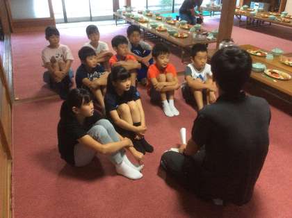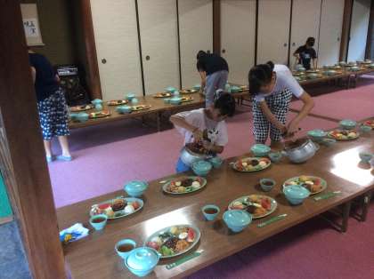 夕食前に、食事係が集合します。打ち合わせの後、みんなのお茶を入れます。「いただきます」「ごちそうさま」のあいさつリーダーもつとめます。