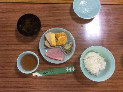 朝食のメニューは、ハム、チキンナゲット、卵焼き、高野豆腐、春雨と野菜の酢の物、味噌汁、ご飯、です。