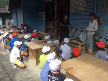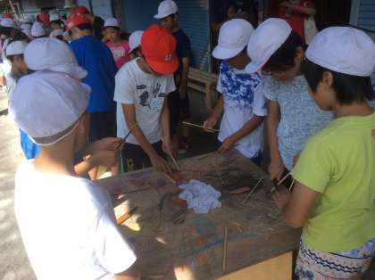 宿舎作業所前に移動して、竹箸作りを始めます。2本の竹棒を小刀で削って、お箸にします。