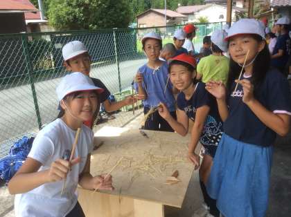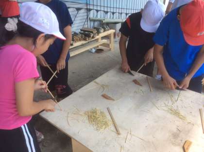 使い慣れない小刀に悪戦苦闘しながら、竹を削っています。