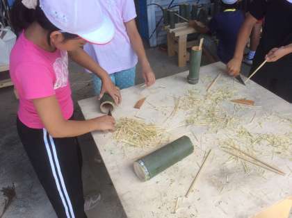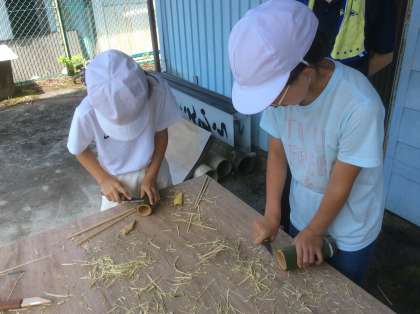 おみやげ用の竹筒をもらい、加工している子もいます。