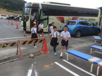 バスの中では、アニメのDVDを見ています。バスに酔った子はいません。