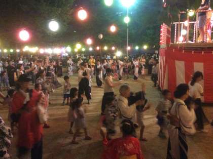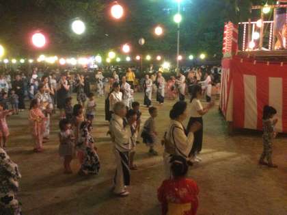 盆踊りが始まりました。一曲目は「もったいないばあさん音頭」、幼稚園で練習している曲です。