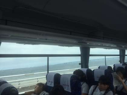 バスは田尻港を過ぎました。右手には海が見えます。車内は子どもたち選曲の歌が流れています。今かかっている曲はマイウェイ。しぶい選曲です。