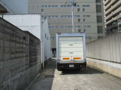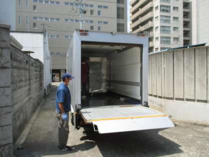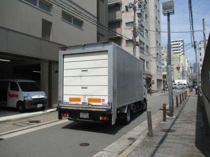 滝川小学校で調理した給食をコンテナに載せ、北稜中学校までトラックで運びます。