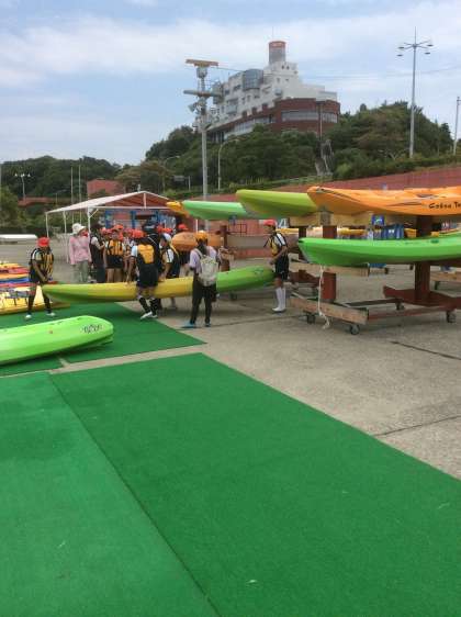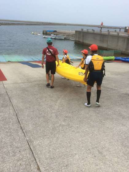 まずは、ライフジャケットを着け、カヌーを海辺まで運びました。
