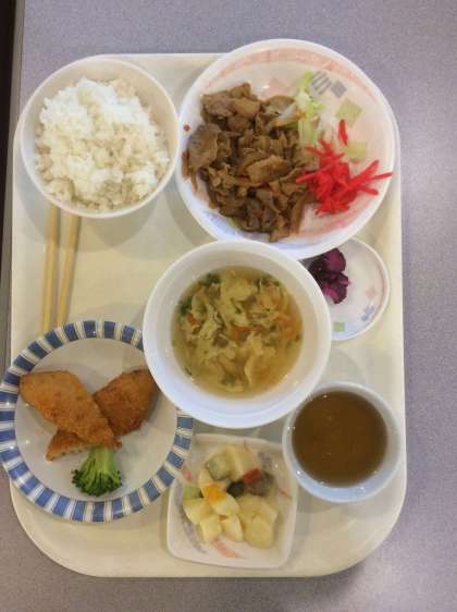豚焼肉、白身魚フライ、ブロッコリー、ジャガイモサラダ、玉子スープ、漬物、ボイルキャベツ。