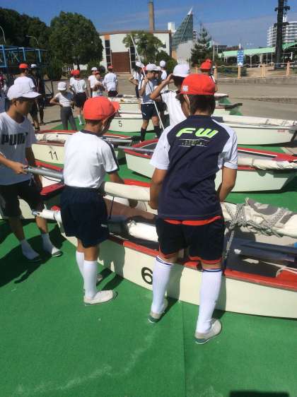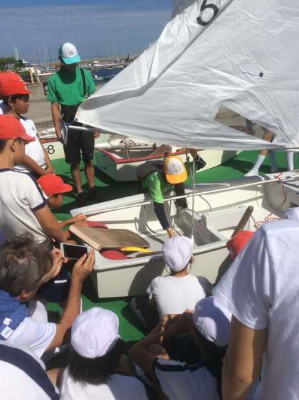 OPヨットの部品を運び終わったので、組み立て方の説明を聞いています。