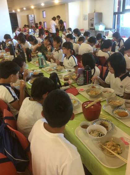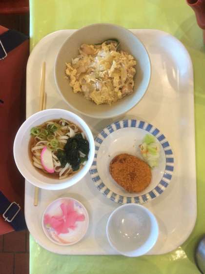 親子丼、冷やしきしめん、カレーコロッケ、ボイルキャベツ、漬物。