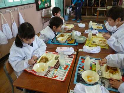 本日(9日)より給食が始まりました。1年生にとっては、小学校生活の最初の記念すべき日です。そのメニューは、子どもたちに一番人気のカレーライスです。しかもカツカレーです。先生から、手洗い、エプロンの着方、直し方、配膳の仕方などを指導され給食室に向かいました。本校の給食のごはんは自校炊飯ですので、とてもおいしいです。ご飯は、炊いたお釜ごと持っていきます。1年生にとっては、2人ががりでも重たいです。配膳すること、食べること、どれもが新鮮なことのようです。「おいしい?」「うん、とってもおいしい。」「じゃあ、おいしいって、あとで調理員さんに言うと、とても喜ぶと思うよ。」「わかった。あとで、調理員さんに、とってもおいしかったって、言うね。」そんな会話を楽しみながら、おいしくいただきました。